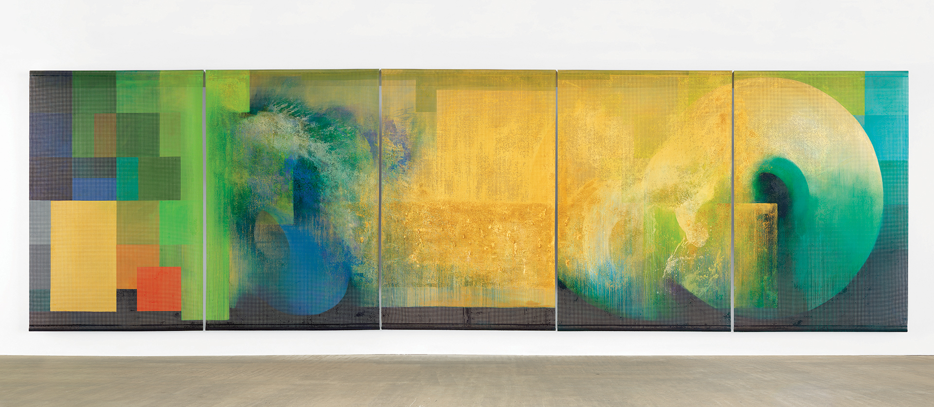 Comprising five mesh panels at a total length of thirty-foot, The Golden Striker occupies a place somewhere between the largesse of the abstract expressionist canvas, avant-garde theatre set design, and postmodern immersive installation. Majestic proportions and mobile spheres link this painting to Tillyer’s Wildenstein Hermitage made almost three decades previously. However, in the early painting the forms are solid and the colours are distinct against a bright white ground. The Golden Strikermarks a continuation of Tillyer’s experiment with the fluidity of acrylic on unmounted mesh, as seen in recent works such as Palmer Triple (2015). Viewing the new painting in the studio surrounded by step-ladders and the apparatus of the artist at work, his fascination with the proscenium arch stage and the dramatic power of work on this scale is evident. The painting is reminiscent of a textile or tapestry – even a backcloth in a theatre or opera performance. Oscillating from a position in front and also behind the mesh, Tillyer is engaged in a creative dance in which he pushes paint through from behind the conventional surface. He invites the viewer’s gaze ‘backstage’, as it were, through the mesh and into contact with the conventionally unseen space behind it. The illusionist is showing us the illusion.